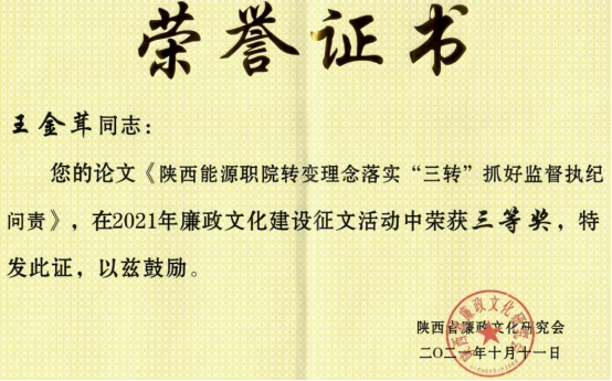 根据陕西省廉政文化研究会《关于2021年廉政文化建设征文获奖论文的表彰决定》,由陕西省廉政文化研究会、陕西高校廉政文化研究中心、陕西省社会科学院廉政建设研究中心、西安交通大学廉政研究所、西北农林科技大学廉政文化研究中心联合发起的面向全省高校纪检监察干部及专家学者征文活动中,我校纪委副书记、综合室主任王金茸撰写的《陕西能源职院转变理念落实“三转”抓好监督执纪问责》论文荣获三等奖。