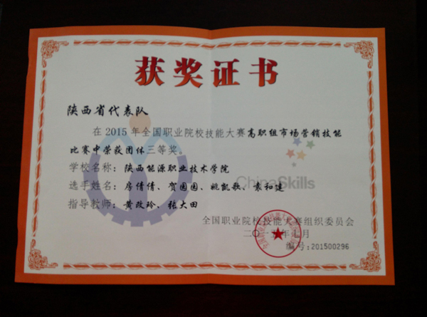 “2015年全国职业院校技能大赛” 高职组市场营销技能比赛于2015年6月5日在无锡商业职业技术学院举行。比赛内容为网络营销和情景营销两个部分。共有来自全国各省的76支代表队参加了本次比赛。由黄改玲、张大田两位老师指导,房倩倩、贺园园、袁和建、姚凯歌四位同学组成的我院代表队获得三等奖。