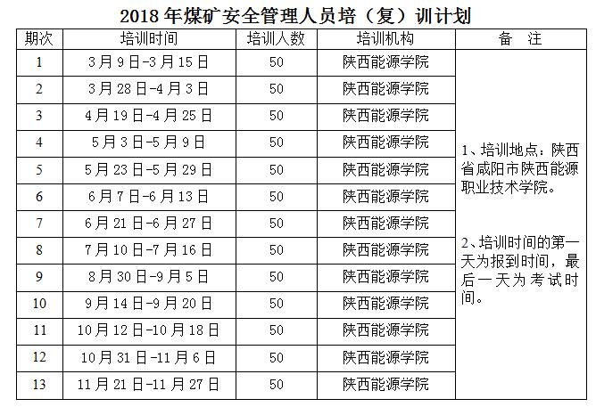 陕西能源职业技术学院安全技术培训中心根据省局有关文件精神,对2018年煤矿安全培训工作进行了安排与部署,并结合我院实际情况,2018年计划在我院举办煤矿煤矿副矿长(总工程师、副总工程师)、煤矿安全生产管理人员培训班(详见附件),我院将严格按照省局要求认真按照培训计划组织培训,严格准入标准,依据规定准备相关资料,经省局考核合格后获取安全生产知识和管理能力考核合格证书。
