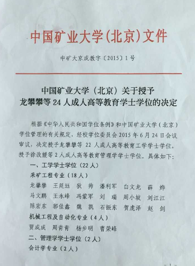 陕西能源职业技术学院系中国矿业大学(北京)在陕函授站,从2012年开始招生。在学院领导的关心支持下,根据中国矿业大学(北京)的教学大纲及教学计划,我院精心组织函授本科教学、毕业设计及毕业答辩等教学环节,2015届函授本科生已于2015年7月顺利毕业。中国矿大(北京)2015届函授毕业生932人,授予学位24人,其中我院毕业生107人,龙攀攀等15人获得工学学士学位。2015届函授本科毕业率达到100%,学位申请通过率较高,学位授予占授予总数62.5%。