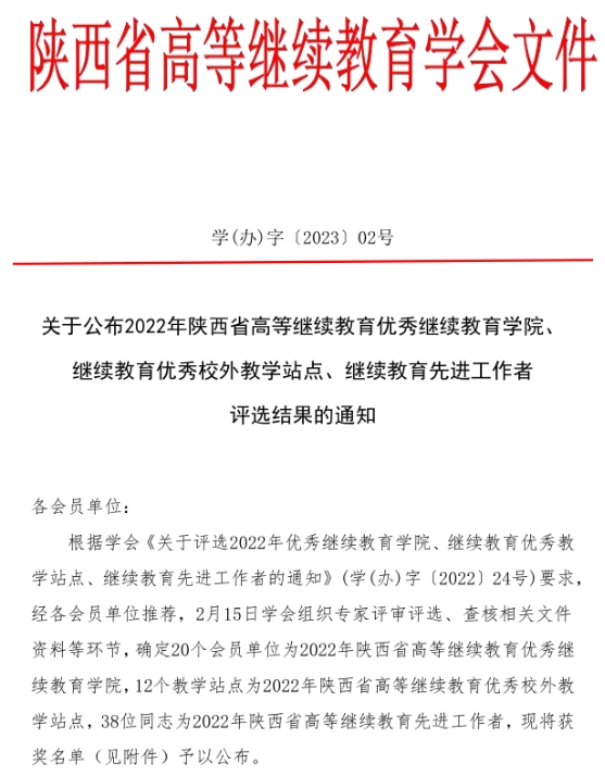 近日,陕西省高等继续教育学会下发了《关于公布2022年陕西省高等继续教育优秀继续教育学院、继续教育优秀校外教学站点、继续教育先进工作者评选结果的通知》(学(办)字〔2023〕02号),我校继续教育学院荣获“陕西高等继续教育优秀继续教育学院”、职工张婷荣获“陕西高等继续教育继续教育先进工作者”。