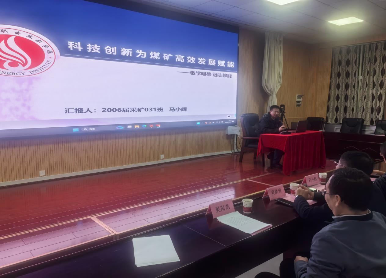 马小辉对母校的培育表示感谢,以“明德任责、远志修能”校训为出发,激励在校的师弟师妹们珍惜时光、珍惜机会学好专业,同时介绍了孟村煤矿的重大成绩、分享了主持的多项矿井技术项目,冲击地压防治工程实践及煤矿智能化开采发展趋势。