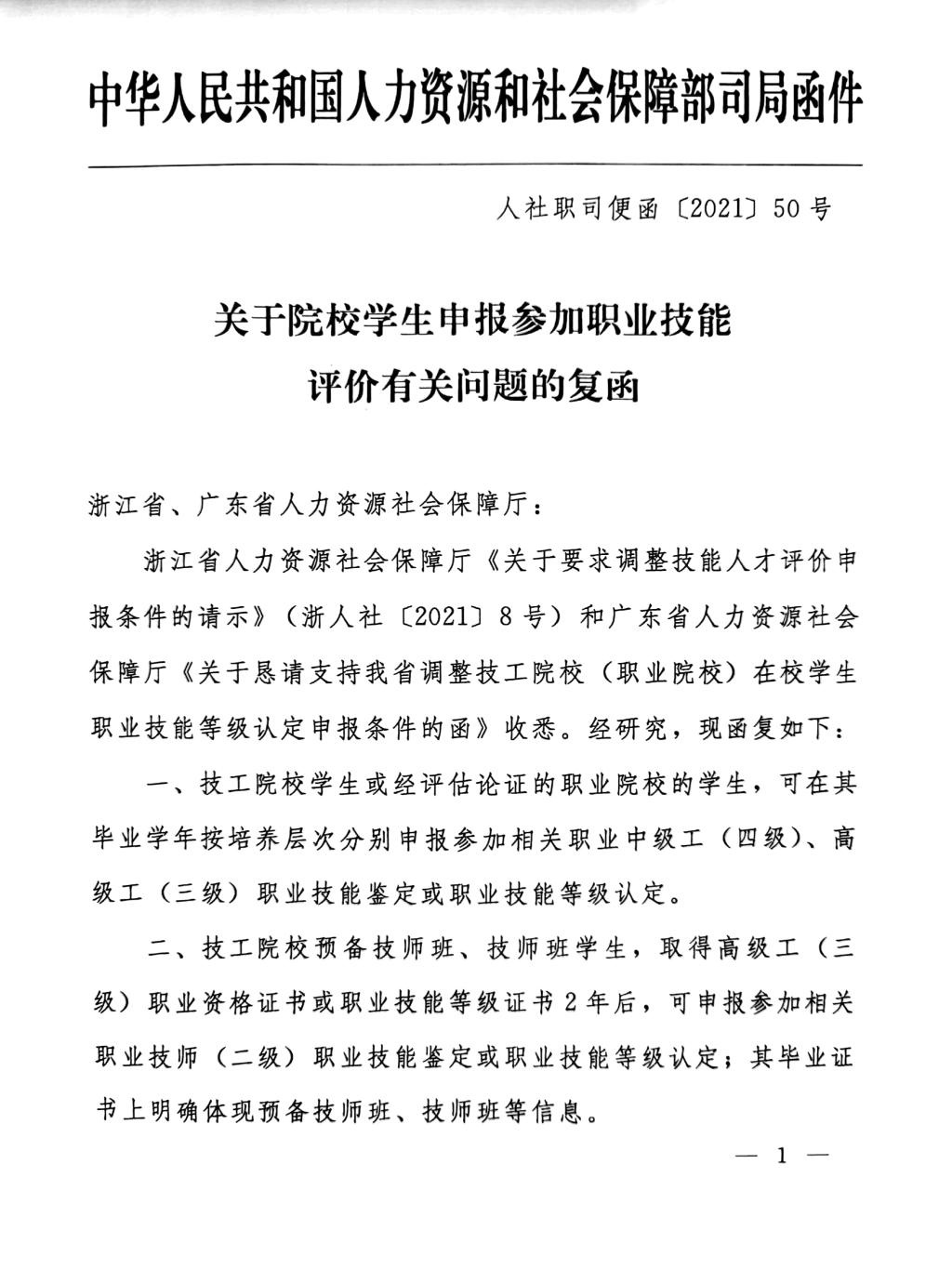 转发《关于院校学生申报参加职业技能评价有关问题的复函》