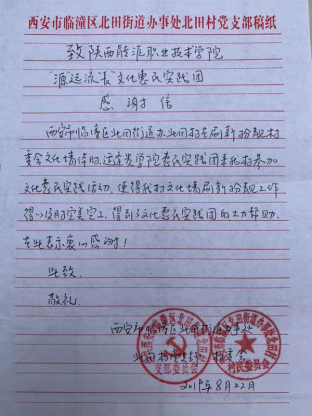本次活动“建国70周年、不忘初心 牢记使命、重拳出击 扫黑除恶、坚决打赢脱贫攻坚战”和“中国传统农耕文化根基”为载体通过绘制临潼北田村委会两面38、46米的文化听取北田村委会党支部书记王晓讲授“无规矩不成方圆”主题党课、发放学校招生宣传册、制作委会办公楼模型等形式,为建立大学生社会实践基地提供了丰富的活动支持,在活动中,队员们表现积极、集思广益、任劳任怨、加班加点高质量完成了各项工作,得到了临潼区北田村委会书面感谢信。