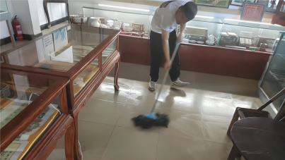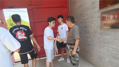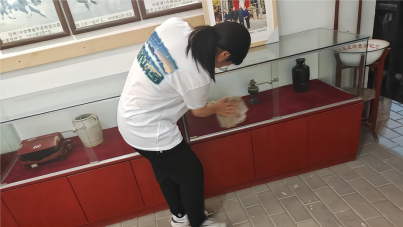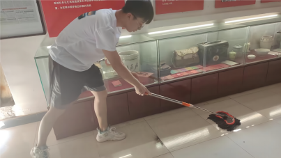 随后,实践团带着清洁工具和防暑物资回到正在扩建的肖何庙村红色记忆博物馆,对各个展厅环境卫生进行打扫并对魏德君馆长和现场施工人员送上防暑物资。因为扩建工程,不少展厅地面和展柜上落下了不少灰尘,细心的实践队员在前一天参观后就萌生了义务卫生劳动的想法。40度的高温下,队员们不惧炎热和辛苦,用自己勤劳的双手和汗水,在红色阵地上书写着属于自己的青春色彩。