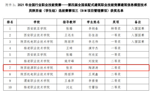 2021年全国行业职业技能竞赛--第四届全国装配式建筑职业技能竞赛(学生组)陕西省选拔赛于2021年10月22日举行。来自全省28所本科、高职院校同场竞赛, 265名选手进行了激烈角逐。结果于10月28日公布。我院建筑与测绘工程学院学生陶源涛同学在BIM深化设计赛项中荣获一等奖、在BIM项目管理赛项取得二等奖;郑一铭同学在BIM深化设计赛项中获得三等奖。