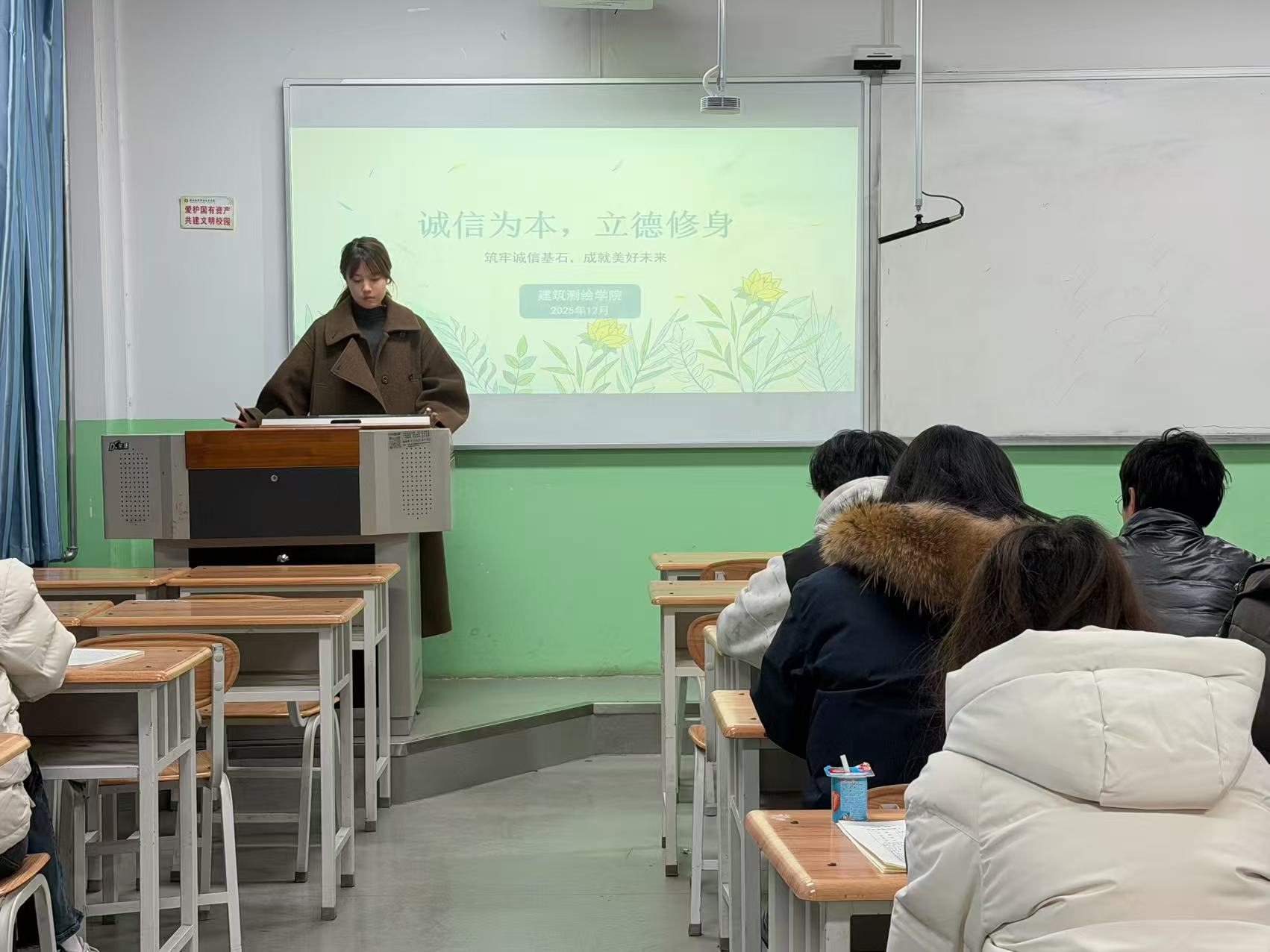 为引导学生深刻领悟诚信内涵,强化规则意识与道德修养,筑牢思想道德根基,12月25日,建筑测绘学院组织全体学生开展“诚信为本,立德修身”主题班会。本次班会以系统学习诚信规范、深化警示教育为核心,助力学生将诚信理念根植于心间、落实到行动。