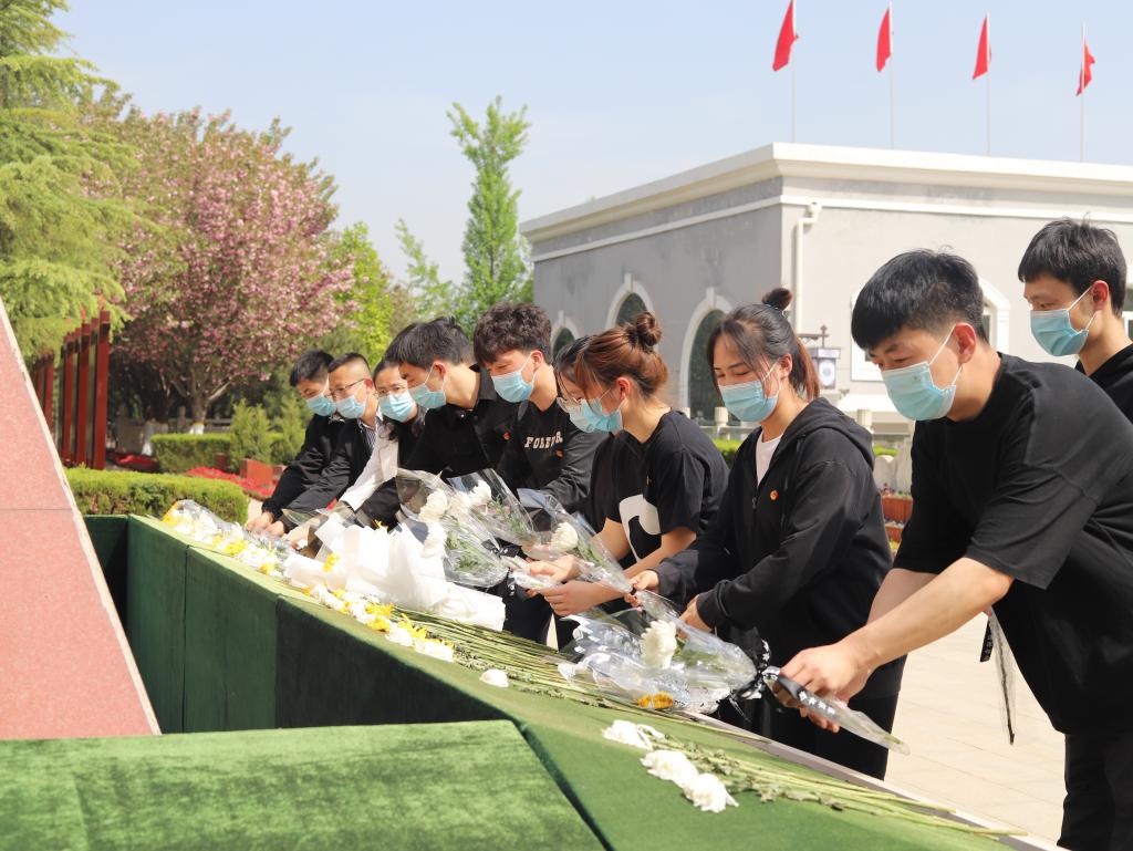 随后,祭扫活动开始,全体师生来到和平广场静默瞻仰,并在和平鸽碑前逐一献花;5名师生代表擦拭烈士墓碑并行三鞠躬礼。