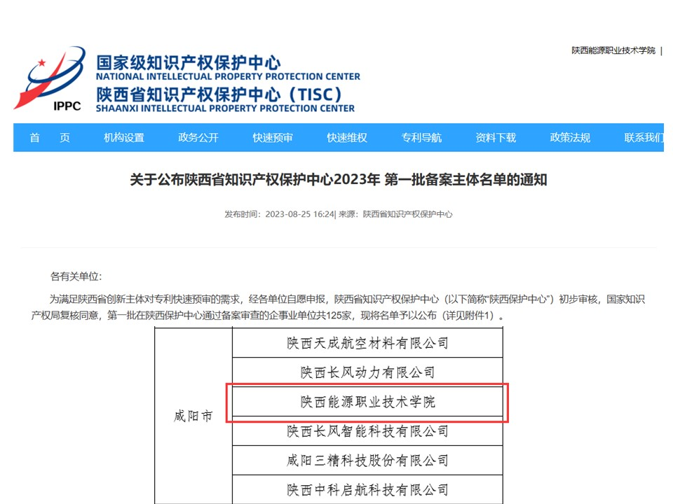 近期,陕西省知识产权保护中心发布了《关于公布陕西省知识产权保护中心2023年第一批备案主体名单的通知》,我校作为省内唯一一所高职院校成功入选,对于学校符合批复的新一代信息技术产业和新能源产业领域的10个分类号专利,发明专利预审授权周期从目前的平均22个月压缩为2-6个月,实用新型和外观设计专利授权周期缩短至1个月。