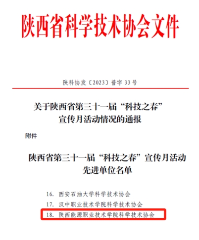 2023年,学校积极推进技术技能创新服务平台建设,成立校科协并召开第一次代表大会,以科技活动为抓手,创新活动方式,大力弘扬科学精神和科学家精神,组织学校科技工作者持续开展科普活动,充分发挥学校科普智能,发挥学校区域及行业影响力,荣获陕西省第三十一届“科技之春”宣传月活动先进单位。
