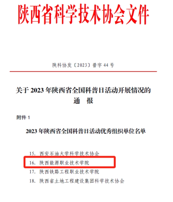 近日,陕西省科学技术协会发布了《关于2023年陕西省全国科普日活动开展情况的通报》(陕科协发[2023]普字44号),全省共举办线上线下群众性科普活动3000余项,我校被评为2023年陕西省全国科普日活动优秀组织单位。