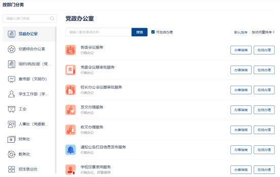 学校师生可在办事大厅查看服务事项指南:办理时间、办事流程、所需材料、咨询电话、办理地点等一目了然,保证线下办事最多跑一次!