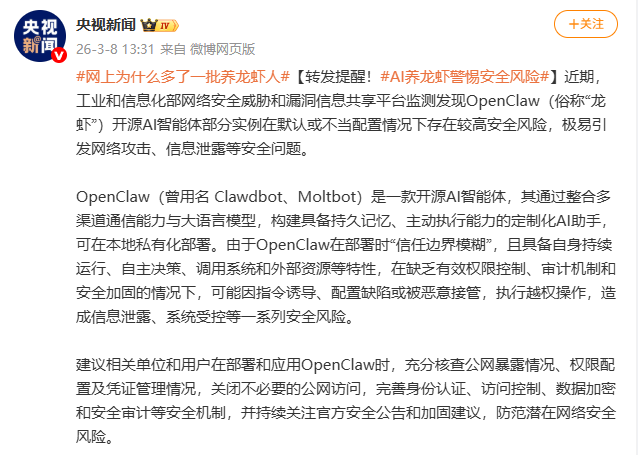 随着“养龙虾”热潮在各大高校蔓延,国家网络安全主管部门先后发布权威提示,及时叫停盲目跟风行为,筑牢校园网络安全防线: