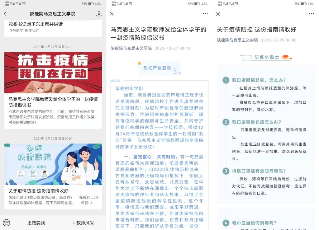 加强宣传教育,筑牢思想防线。马克思主义学院统筹宣传资源,充分利用新媒体平台,在陕能院马克思主义学院微信公众号推送《马克思主义学院教师发给全体学子的一封疫情防控倡议书》、《关于疫情防控,这份指南请收好》等资料,开展思想教育宣传,加强舆论正面引导,使广大师生充分了解防疫知识、掌握防控要点,筑牢思想防线。