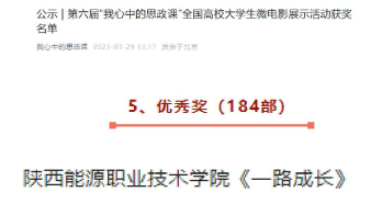 近日,在教育部高校思想政治理论课教学指导委员会主办、武汉大学马克思主义学院承办的“我心中的思政课”——第六届全国高校大学生微电影活动中,我校马克思主义学院孙乐策划,王译若、张怡带领学生团队创作拍摄的《一路成长》,从1684部参赛作品中脱颖而出,荣获微电影类全国优秀奖。