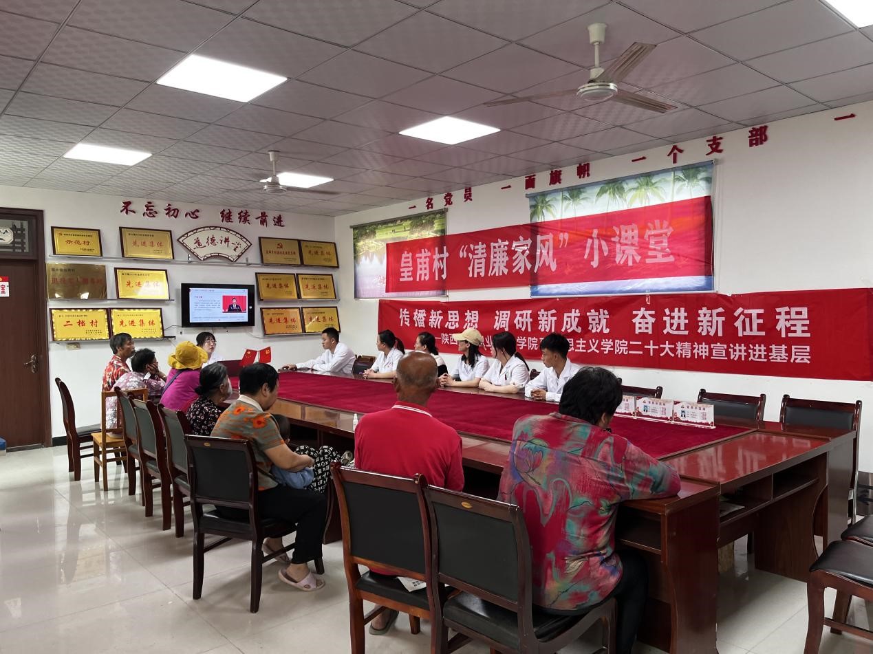 为深入学习党的二十大精神,全面贯彻习近平新时代中国特色社会主义思想,7月14日,我校马克思主义学院教师马悦在富平县留古镇皇甫村党群服务中心为村民、卫生院工作人员和实践队成员宣讲党的二十大精神。