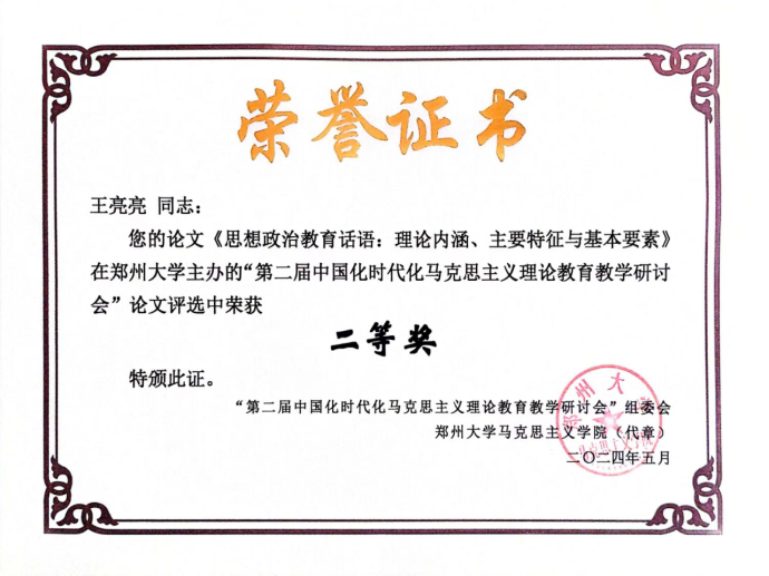 5月11日,由中共河南省委教育工委、河南省教育厅指导,郑州大学主办、郑州大学马克思主义学院承办的“第二届中国化时代化马克思主义理论教育教学研讨会”在郑州大学召开。来自北京大学、武汉大学、西安交通大学、陕西能源职业技术学院等国内80多所高校、社科研究院所的100余位专家学者、研究生参会。我院青年教师王亮亮应邀参会并参与分论坛研讨活动,其论文《思想政治教育话语:理论内涵、主要特征与基本要素》荣获二等奖。