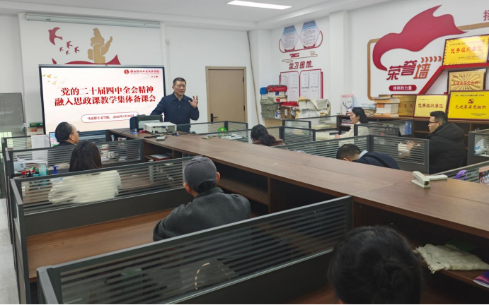 备课会上,马克思主义学院负责人高慧围绕党的二十届四中全会提出的 “坚持和完善中国特色社会主义制度、推进国家治理体系和治理能力现代化”总体布局,结合“加快经济社会发展全面绿色转型”“美丽中国建设取得新的重大进展” 等关键部署,系统梳理了全会精神与思政课教学融合的核心逻辑。从国家发展战略全局出发,明确了教学主线,在理论层面,衔接全会关于坚持党的领导、统筹发展和安全、推进高质量发展等重大论断,构建思政课的理论支撑体系;在实践层面,关联全会部署的科技创新、乡村振兴、生态文明建设等重点领域的战略安排,展现国家发展的系统布局;在价值层面,落脚于青年一代的使命担当,引导学生理解个人成长与国家治理、民族复兴的内在联系。同时,高慧提出通过案例教学、互动研讨等方式,让全会精神从国家战略转化为课堂内容,从理论话语转化为学生话语。