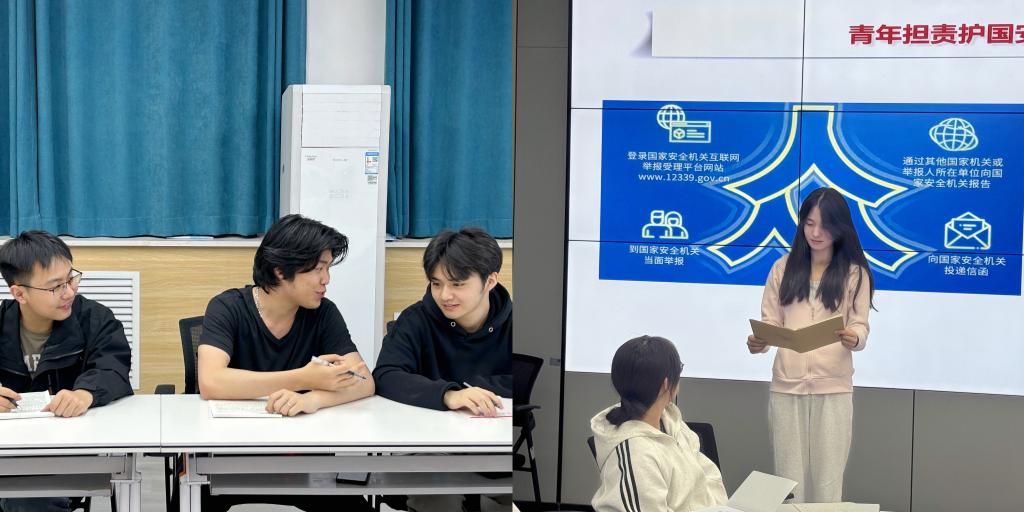 杨淑妮老师以第十个全民国家安全教育日主题宣传片《守护•十年》作为切入点,“历史之鉴、现实之需、未来之要”三个方面引导学生深入理解国家安全是民族复兴的根基,社会稳定是国家强盛的前提。接着,杨淑妮老师组织学生讨论“作为新时代青年,如何守护国家安全?”,同学们积极参与,从增强国家安全意识、守好日常“安全红线”防范境外势力渗透发现可疑情况时及时向国家安全机关报告等方面分享自己的见解。最后,所有同学参加了中国大学生在线开展的“全国大学生国家安全知识答题”活动,掌握了国家安全相关法律法规,并通过题目解析深入了解了国家安全的多维度内涵。