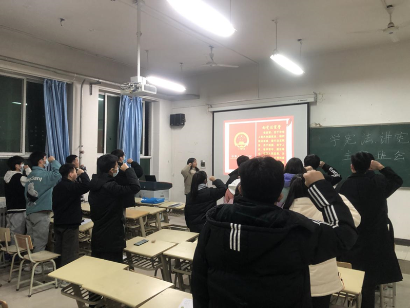 煤洁2201班的团支书带领班级全体同学进行庄严宣誓,维护宪法权威。
