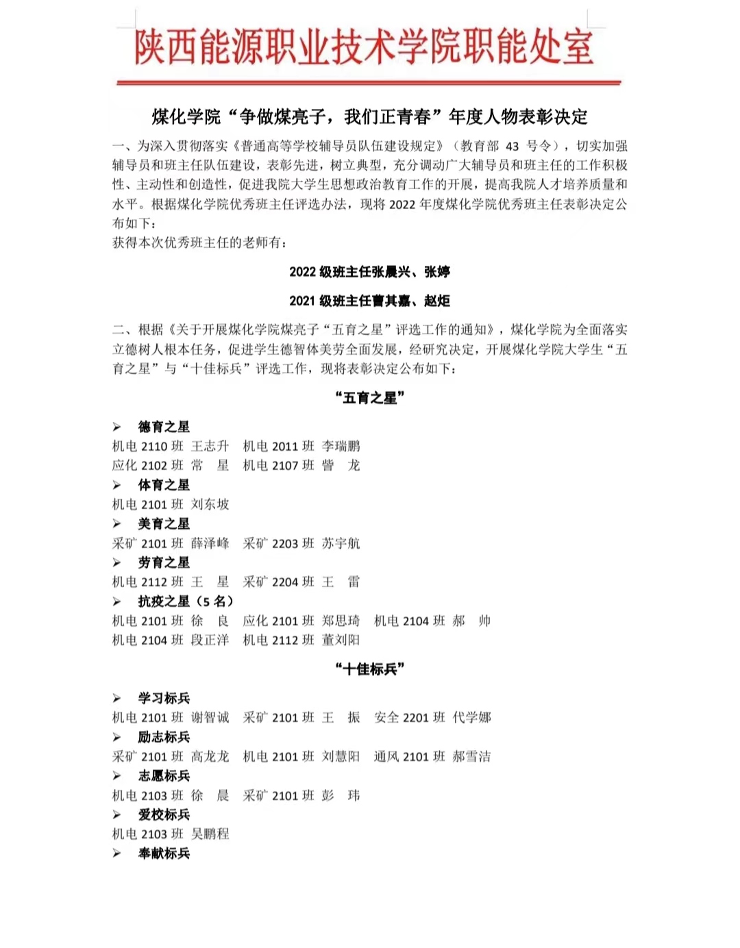 “争做煤亮子,我们正青春”年度人物表彰决定