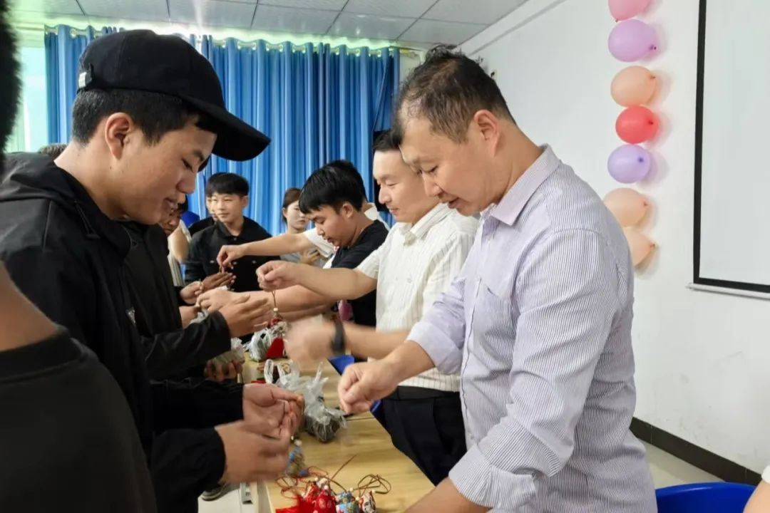 在互动环节中,学院领导为同学们送上精心准备的端午礼包,包含粽子、五彩绳和艾草香囊。特别设置的“蒙眼喂粽子”趣味比赛将活动推向高潮,各族同学随机组队,在欢声笑语中完成挑战。