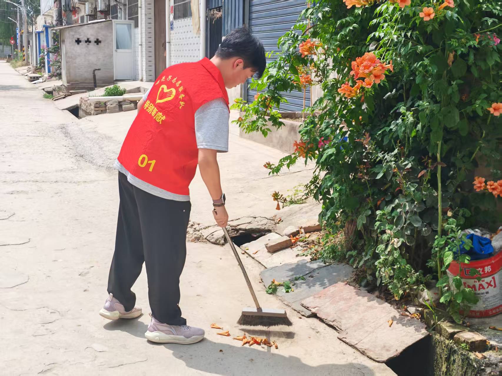 庭院美化照料: 志愿者们为老人悉心浇灌花草绿植,增添生活气息。