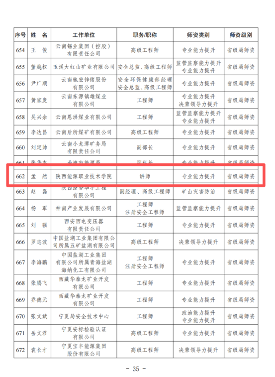 教师孟然长期深耕矿山安全教学与科研一线,潜心钻研专业知识,熟悉矿山安全领域法律法规、技术规范及行业前沿动态,具备扎实的理论功底和丰富的实践教学经验,教学能力突出、职业素养优良。此次经陕西局推荐申报并成功入选,既是国家矿山安全监察局对其个人专业能力和教学水平的高度认可,也充分彰显了我校在矿山安全专业师资队伍建设、人才培养质量等方面的显著成效。