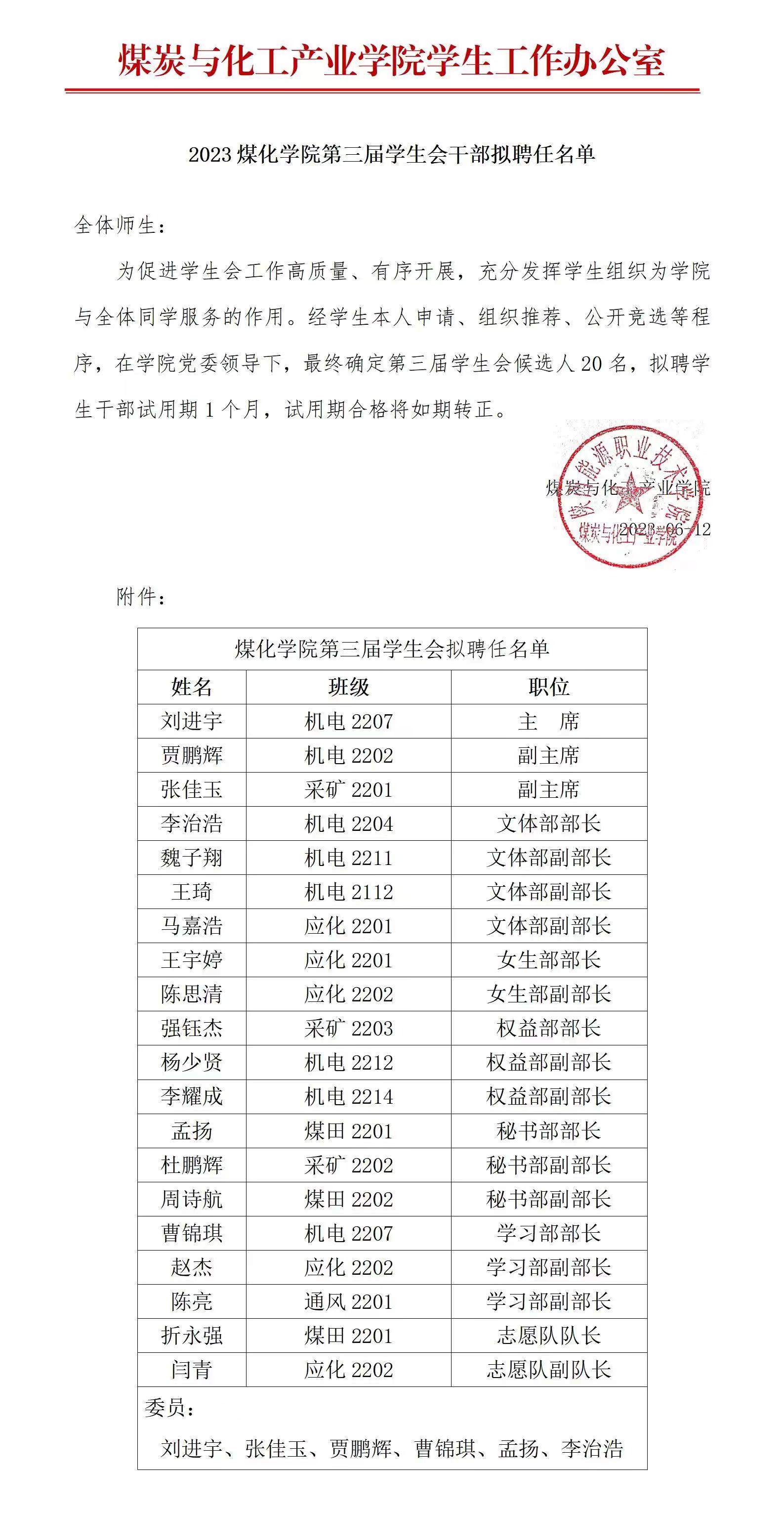2023煤化学院第三届学生会干部拟聘任名单公示