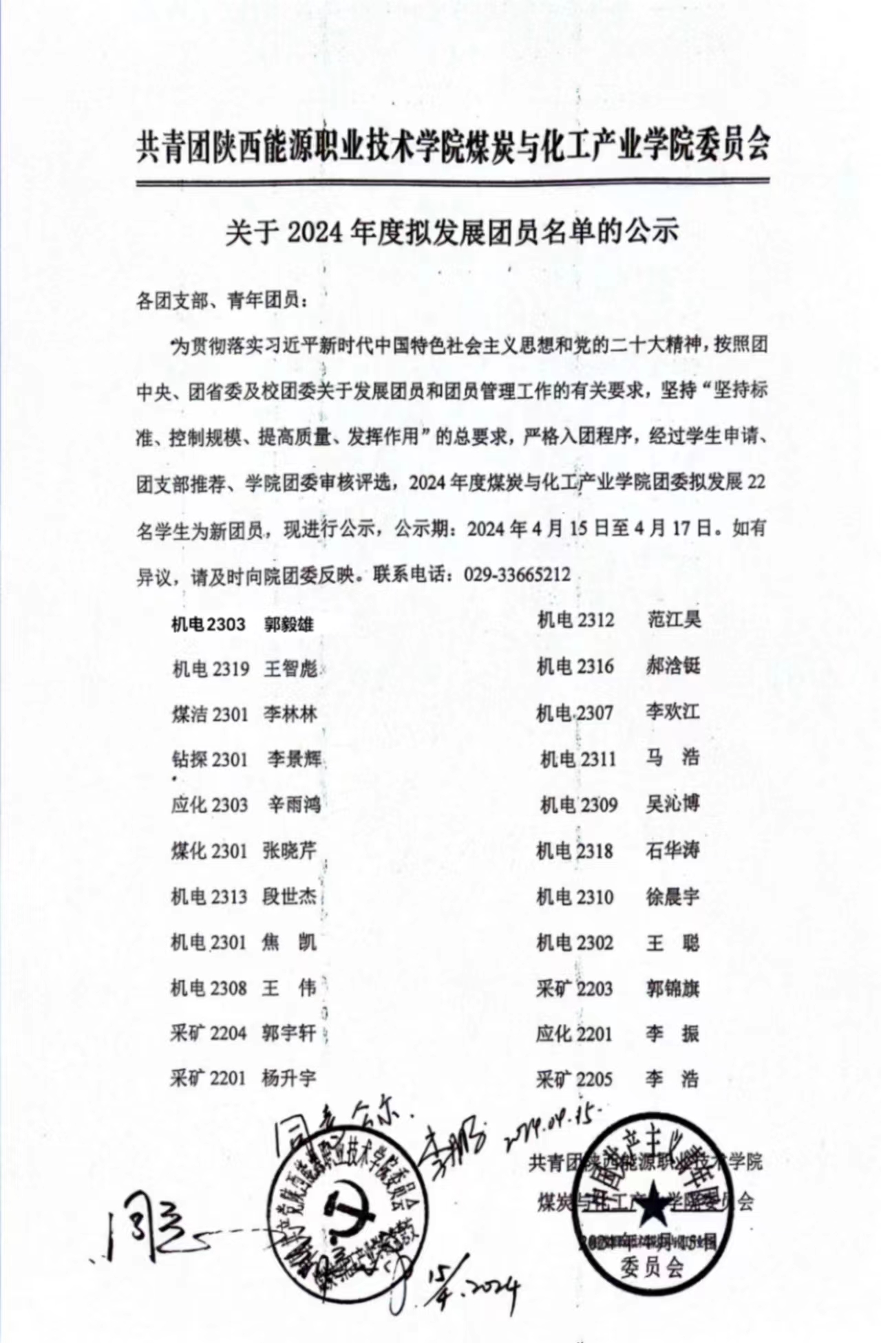 关于2024年度拟发展团员名单公布