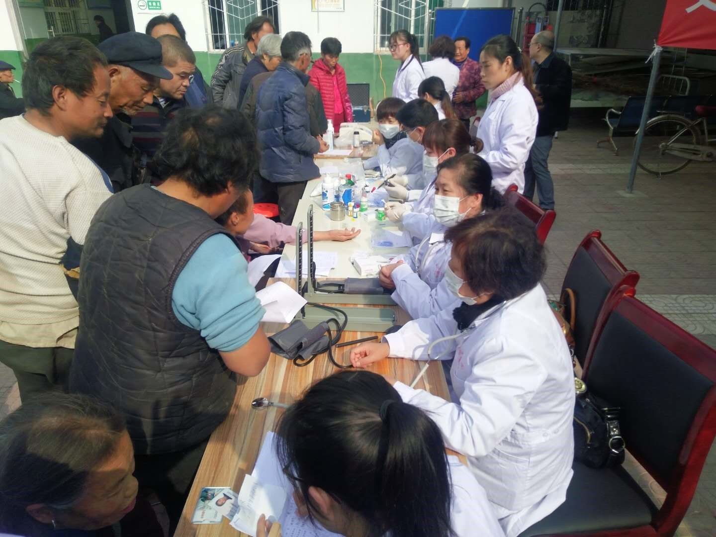 义诊活动在兴平赵村镇赵北村进行,内容包括免费体检、健康宣教、公共卫生服务咨询、急救知识宣讲等。一大早,老乡们就来到义诊活动现场,有年迈的老人,也有带着孩子的妇女,大家有序排队领取体检表量血压、测血糖、测听力、测血型、做心电图和尿常规检查并咨询健康问题。医生们个个热情地接待、认真的检查、耐心地解答,针对每位检查者不同的情况给予生活和饮食上的建议,得到了村民们的一致认可和赞赏。