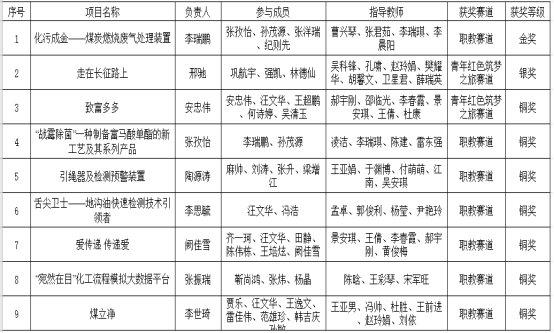 本次比赛全校共报名309个项目,经过二级学院初赛、校赛及省赛赛前遴选打磨等阶段,最终推荐引绳器及检测预警装置”、“走在长征路上”等10个项目参加省级复赛。省级复赛阶段化污成金—煤炭燃烧废气处理装置”项目获得职教赛道走在长征路上”项目获得“青年红色筑梦之旅"赛道是我校在此赛事上的最好成绩。