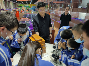 学生在参观过程中,积极向讲解教师询问,并且自己动手操作显微镜,观察矿石内部结构,魏奥林老师告诉大家,这种观察实验在以后的学习中要经常用到。