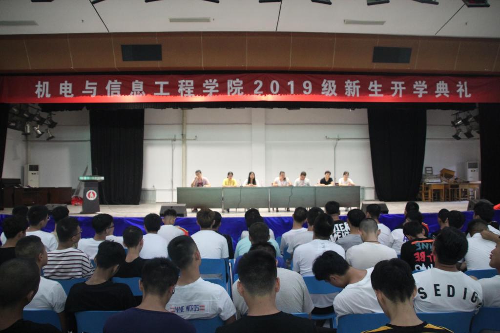 8月30日上午10:00,机信学院2019级新生开学典礼在菊园四楼大学生活动中心隆重召开。机信学院院长李志、副院长刘涛、综合办主任张继军、学工办主任冯帅、全体辅导员及新生班主任与1014名新同学一起参加了本次开学典礼。开学典礼由刘涛副院长主持。