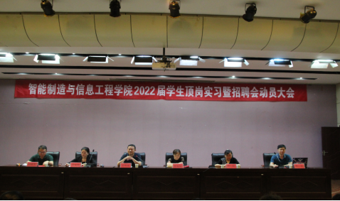5月27日晚上7点30分,智能制造与信息工程学院2022届毕业生顶岗实习暨招聘会动员大会在实训楼六楼报告厅召开。智信学院党总支书记曹俊侠、院长李炜怿、党总支副书记李粒、教学办主任李智、学工办主任景安琪、全体专业课教师、辅导员及463名2022届毕业生参加本次会议,会议由智信学院综合办主任张继军主持。