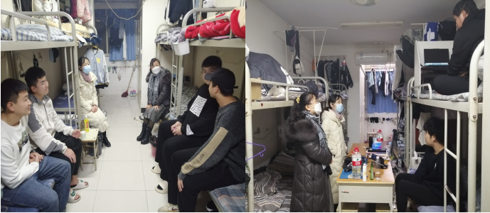 12月24日晚,曹俊侠、李粒、徐永帅、雷妍深入男生公寓,针对近期学生中出现的打架、心理及生病等难点问题,分别走访了6个宿舍,为学生进行心理疏导及安抚工作。走访中,曹俊侠与同学们深入交谈,解决同学们的思想问题,同时欣赏了学生门的才艺表演,倾听了同学们的心声,询问了各个方面的生活情况,解答了同学们在学习上、生活上等各方面问题。鼓励同学们活跃宿舍生活,保持心情舒畅,尤其嘱咐同学们要严格遵守防疫期间校园管理规定,不聚集,不传谣,保持宿舍卫生,做好个人防护,营造舒适的生活环境。