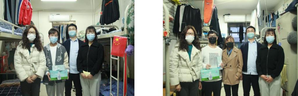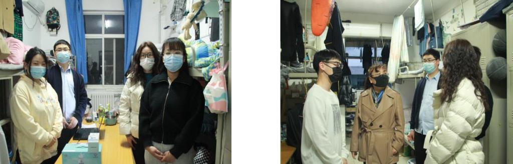 智信学院党总支副书记李粒、团委书记景安琪、团委副书记郝宇刚以及辅导员师婷深入到学生宿舍,重点对经济困难学生送去慰问品和关心,对学生的卫生整理、疫情防控进行了调查,嘱咐学生要及时反馈学习和生活中所遇到的困难的各类问题,学校、学院将全力保障在校同学的生活舒心、学习安心,同时在这段特殊的时期中,同学们也要注意宿舍卫生,积极配合学校的疫情防控工作。