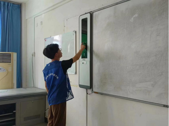 同学们对多媒体设备进行全面检测和清理,确保设备的正常运行,清洁教室白板,统计桌椅数目,保证教室课桌数和上课学生数匹配准确。