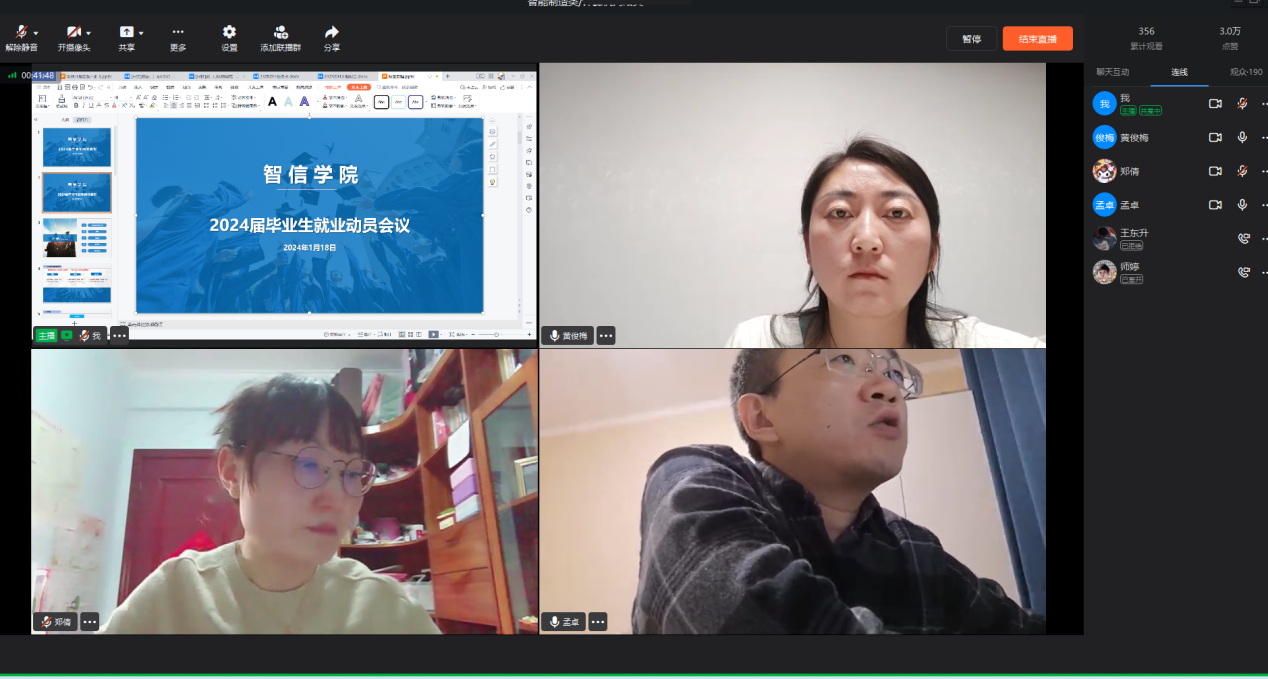 为全面推进2024届毕业生就业工作,引导学生树立正确的就业观念,提高就业的积极性和主动性,智能制造与信息工程学院于2024年1月18日晚8点,通过钉钉直播方式在线上召开了2024届毕业生就业动员会。智信学院副院长黄俊梅、党总支副书记孟卓,辅导员王文婷、2021级班主任及2024届全体毕业生参加大会。会议由智信学院学工办主任郑倩主持。