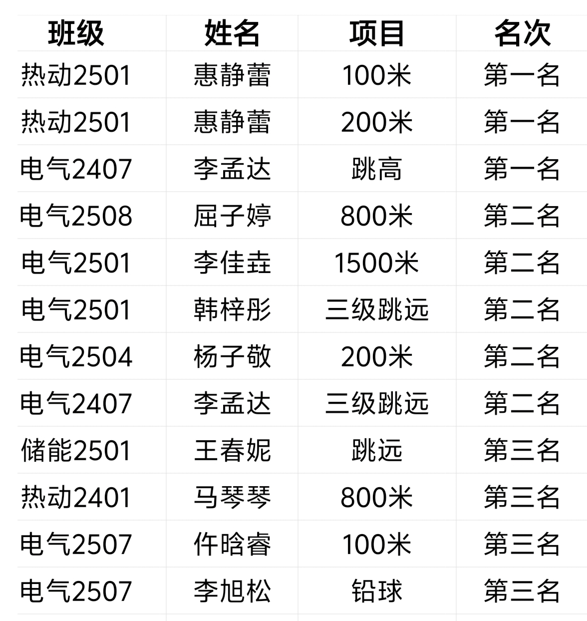 除此之外,我们学院还有许多优秀的运动员在本次运动会上取得了好成绩。愿全体能源学子带着赛场上的勇气与热忱,将拼搏精神融入专业学习与科研探索,在新能源领域勇攀高峰、逐光前行,以青春之我、奋斗之我,为推动能源转型、建设绿色中国贡献青春力量,书写更加精彩的青春篇章。