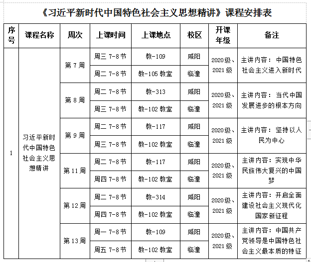 2、该课程实际上课时间以习近平新时代中国特色社会主义思想精讲课程安排表为准(见附件),学生选课时注意查看课程安排表后再进行选课,以免与其他课程产生冲突。