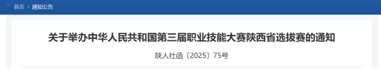 为贯彻落实习近平总书记关于技能人才工作的系列重要指示批示精神,加强新时代高技能人才队伍建设,根据《人力资源社会保障部关于举办中华人民共和国第三届职业技能大赛的通知》(人社部函〔2025〕16号)精神,决定举办中华人民共和国第三届职业技能大赛(以下简称第三届全国技能大赛)陕西省选拔赛(以下简称省选拔赛),现将有关事项通知如下: