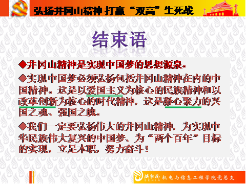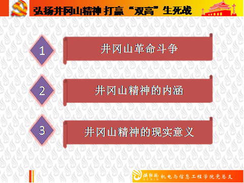 机电与信息工程学院第一教工党支部全体党员认真学习了刘浩书记的讲话,结合自身工作岗位,弘扬井冈山精神,坚守教育第一线。大家普遍任务通过本次学习受益匪浅。