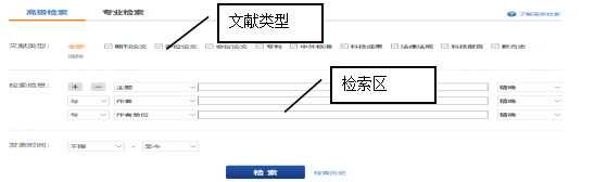 高级检索中包含跨库检索和专业检索两种方式,其中专业检索适于专业信息人员使用。高级检索如图2.1-2所示,分为检索区、文献类型选择区和检索历史区。