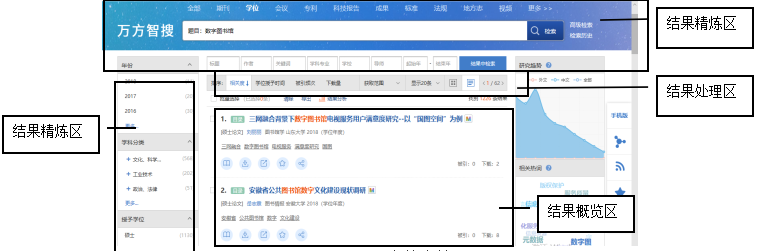 检索结果界面分为三部分:概览区、结果处理区、结果精炼区,如图2.1-3所示。