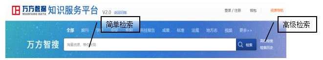 万方数据提供简单检索、高级检索和专业检索三种检索方式。简单检索界面简洁、易用,如图2.1-1所示。