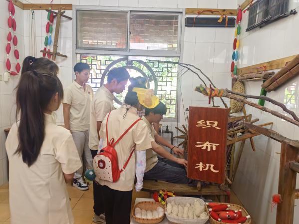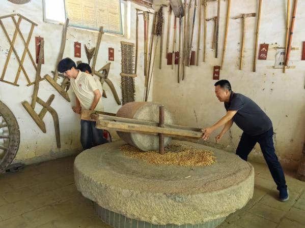 活动中,实践团成员积极参与各项活动,亲身感受传统民俗文化的魅力。园内负责人带领实践团参观了传统农具,大家亲手操作石碾、石磨,在劳作中体会农耕时代的生产智慧;在纺织机前,成员们尝试纺线织布,近距离感受传统农耕与手工业文化的智慧,感受手工业者的辛劳与坚守。手艺人现场展示非遗项目鹿糕馍的制作技艺,学生们参与实践制作,深度体悟饮食文化的传承脉络;随后,实践团参观园内古画与名人书法作品,在笔墨间感悟传统文化的文字魅力与精神内涵;最后,通过观赏墙面壁画展板中呈现的名言、民俗方言等内容,进一步深化对当地民俗文化的认知。