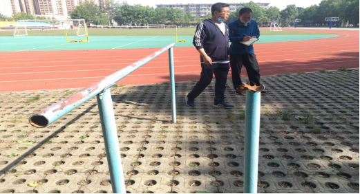 田径场是开展体育教学工作的重要保障,体育器材是线下开展体育教学活动的基础,2020年5月15日上午,体育部主任牛大刚和办公室主任陈理、教师高海一起,本着“以学生安全为主”的指导思想,对体育场地、器材进行了认真的检查,对存在和可能存在安全隐患的地方均记录在案,最后,统一上报有关部门进行检修。保证春季开学线下体育教学工作正常、有序的开展。