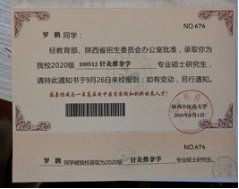 1、17级针灸推拿专业罗鹏同学以优异成绩被陕西中医药大学2020级针灸推拿专业硕士研究生学院录取(罗鹏为该届专硕中成绩最高者)。
