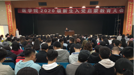 为了学习贯彻习近平“不忘初心、牢记使命”主题教育,做好2020级新生入党启蒙教育工作,医学院学工支部于2020年11月15日晚7:30在咸阳校区大学生活动中心召开了新生入党启蒙教育大会,参加本次大会主要成员有2020级新生及老师约1400余人。会议由伊龙老师主持。